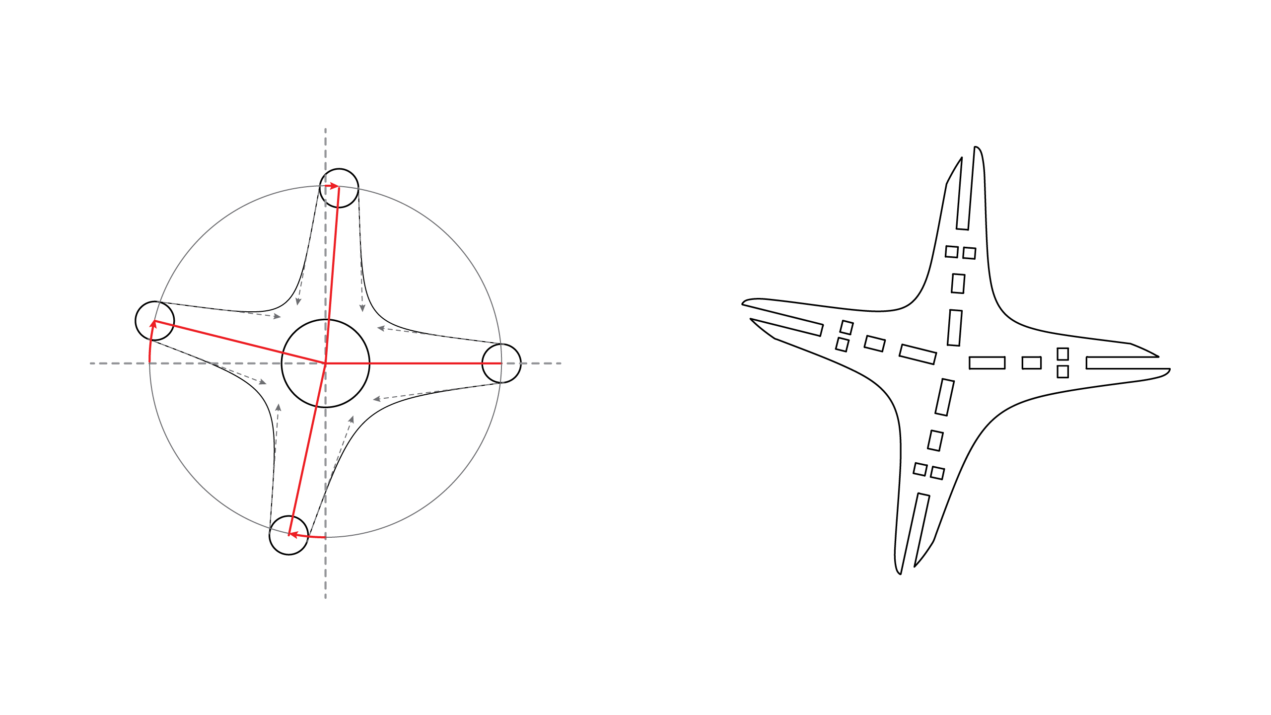 The approach towards design and construction is based on the definition of hierarchical rules through the system itself: the basic cross-shaped modules are first assembled in small units, structurally stabilized thorugh tensile elements. These simple units can be then used as elements of the landcape (urban furniture) or be further assembled in the main structure to be built. This logic allows for continuous modification and adaptation of the system itself.