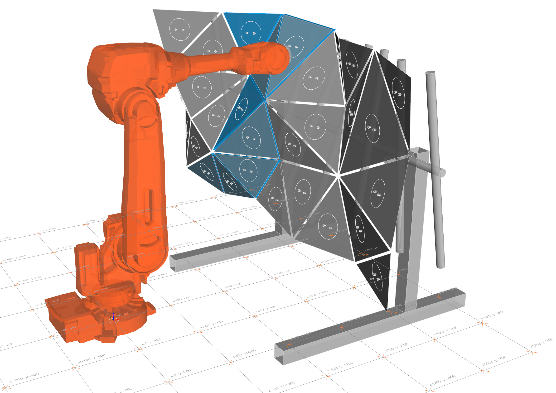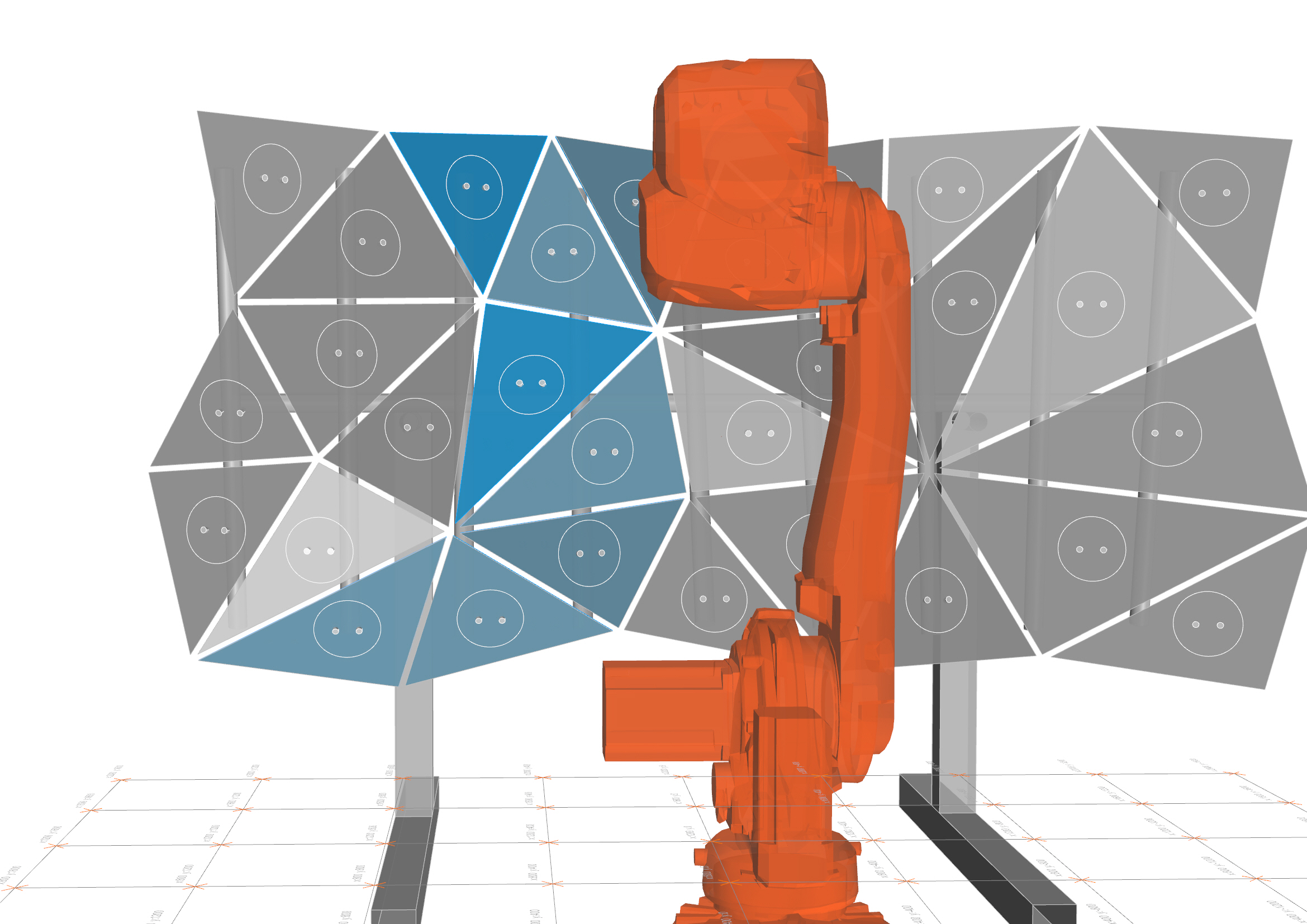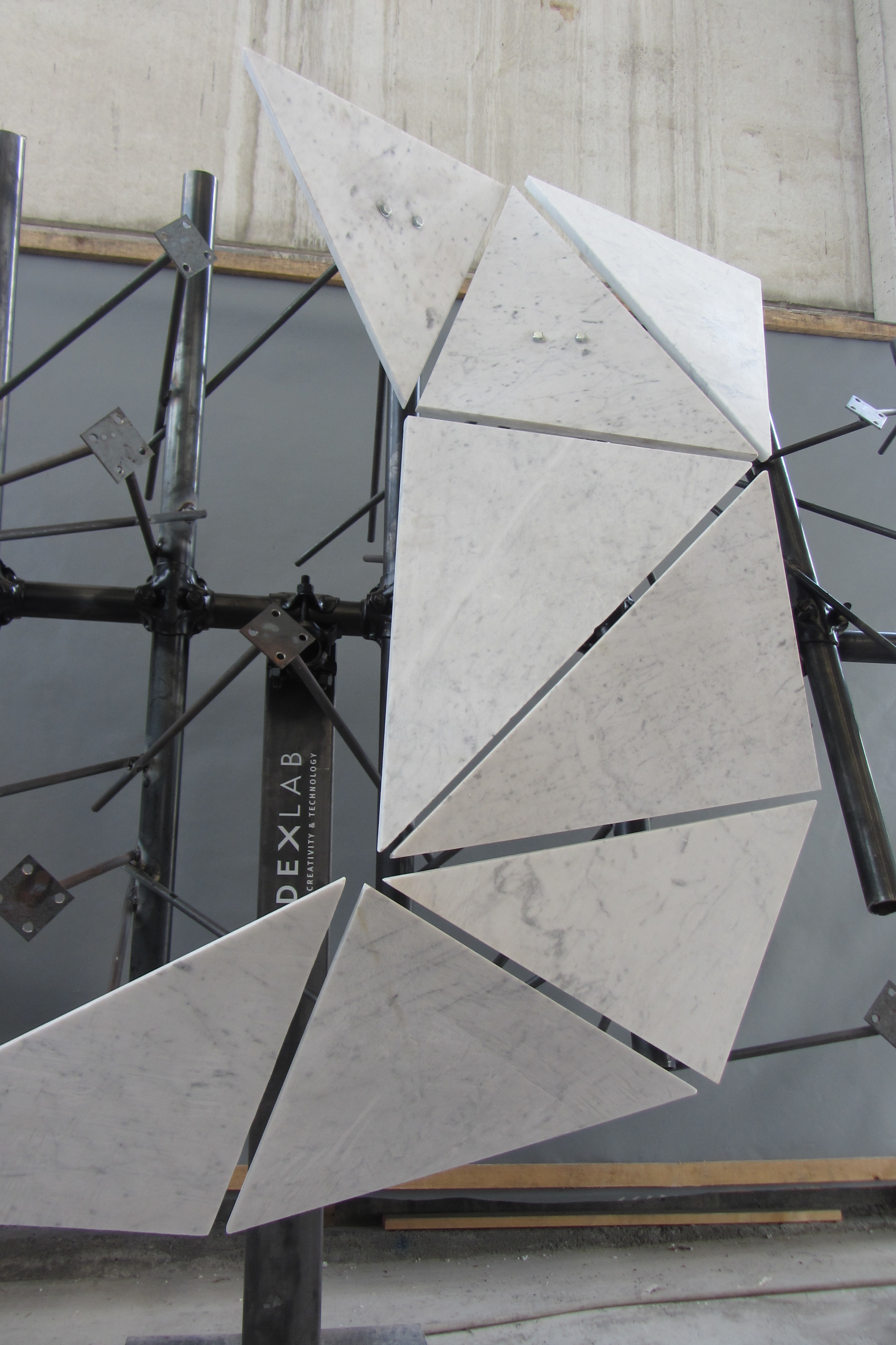 Carrara Robotics was a one-week research collaboration between IndexLab, TD Robotics, ABB and MGI Marmi.The aim was to explore the possibilities of robotic fabrication for the stone industry. The installation proposed (designed by Lila Panahi Kazemi and Andrea Rossi) is a complex triangulated wall made of marble panels, aseembled on an adaptive steel structure. Instead of constructing a complex and expensive substructure to hang the panels, each component is put into position by an IRB4600 industrial robot, and subsequently weld to the main structure with steel bars.